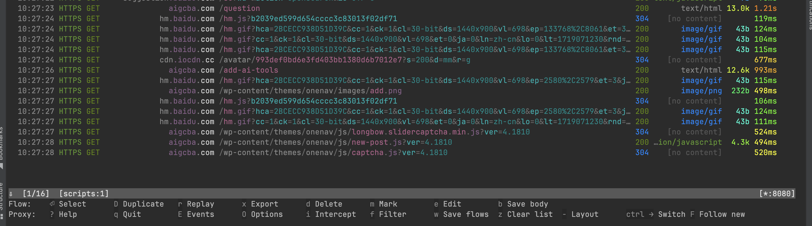 在浏览器中访问https://aigcba.com,所有请求将被捕获并打印到终端。这个时候终端会打印所有的浏览器请求。log.logs里面就只会保存aigcba.com的请求记录。因为我们在前面的代码里面进行了判断。