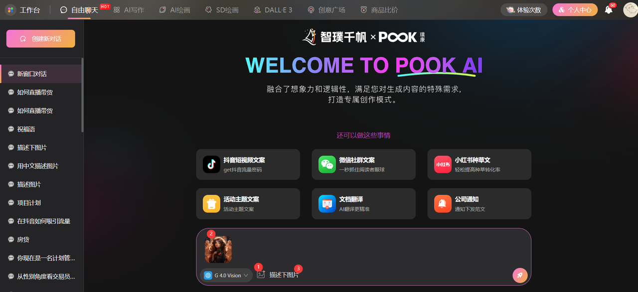 6.G4.0 Vision模式,点击上传图片按钮上传图片/拖拽上传图片,输入提问信息,点击【发送】按钮。