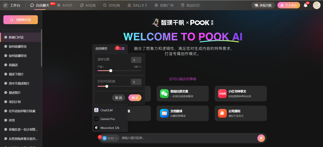 7.点击模式出现弹框,点击【设置】,设置温度、轮数,点击【确定】,设置成功,设置参数对回答内容生效。